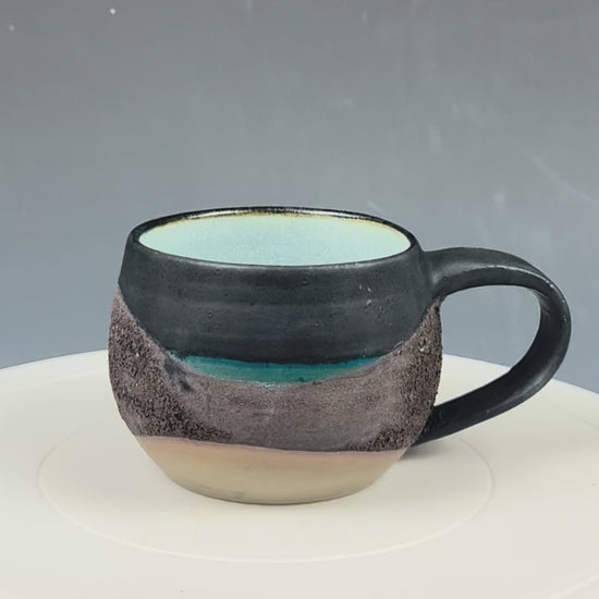 This round landscape mug has a great textured surface - the softest bottom ever contrasted with a band of magma - and fits a perfect morning coffee.